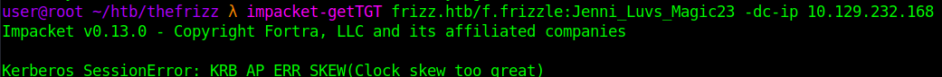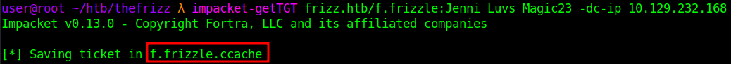 impacket-getTGT frizz.htb/f.frizzle:Jenni_Luvs_Magic23 -dc-ip 10.129.232.168