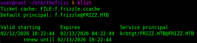 Verify with klist. Kerberos authentication is now established for f.frizzle.