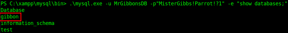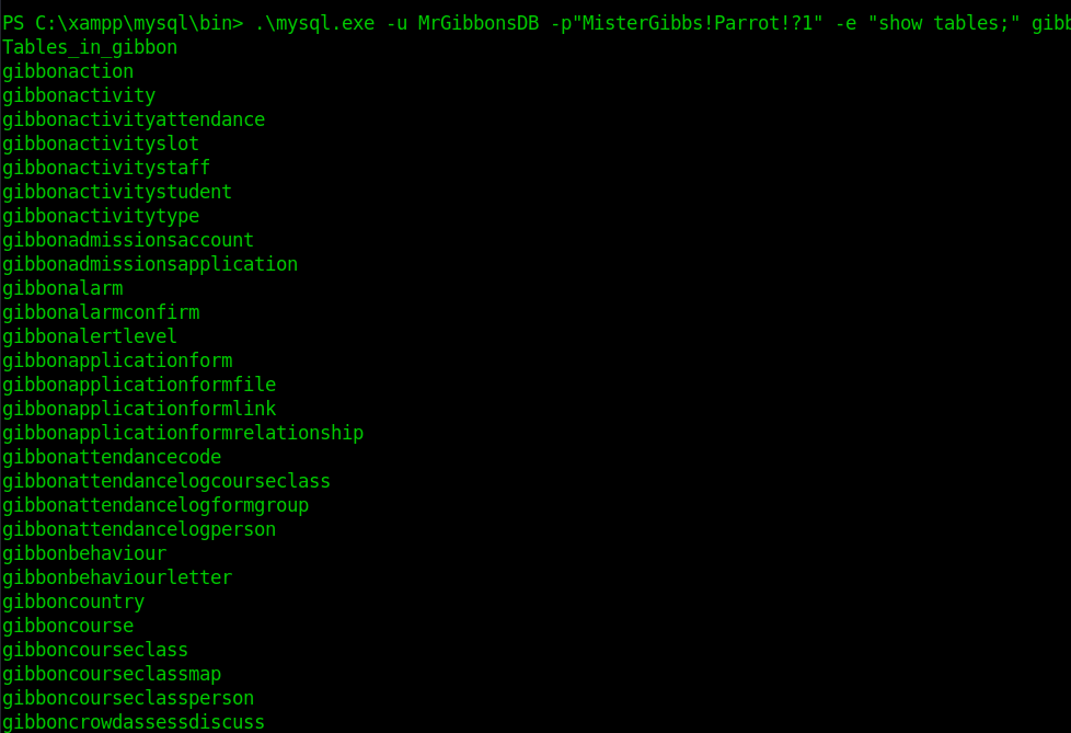 .\mysql.exe -u MrGibbonsDB -p"MisterGibbs!Parrot!?1" -e "show tables;" gibbon