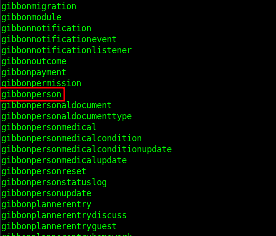 The gibbon database is identified. List tables: