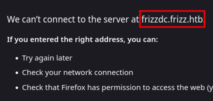 Add frizz.htb and frizzdc.frizz.htb to /etc/hosts to enable proper name resolution.