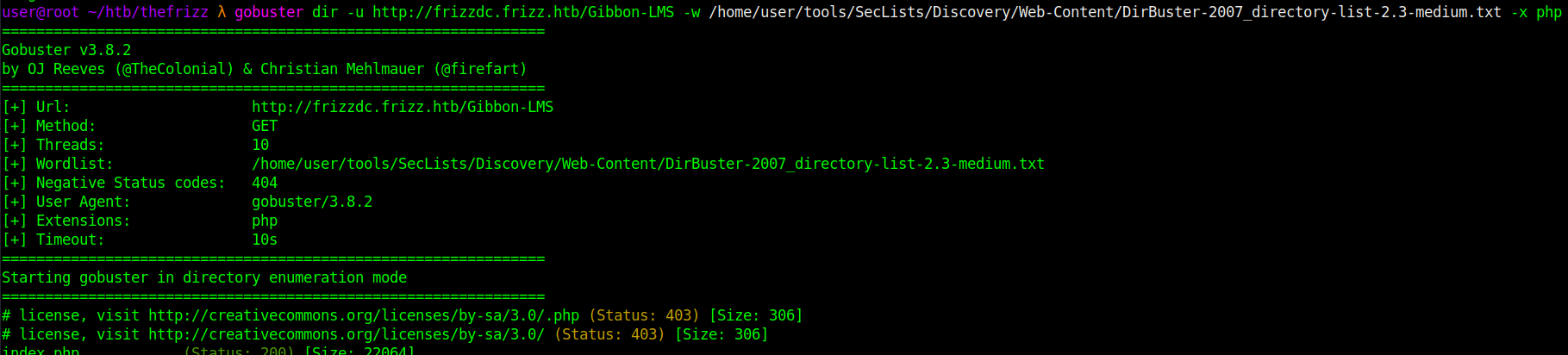 gobuster dir -u http://frizzdc.frizz.htb/Gibbon-LMS -w /home/user/tools/SecLists/Discovery/Web-Content/DirBuster-2007_directory-list-2.3-medium.txt -x php