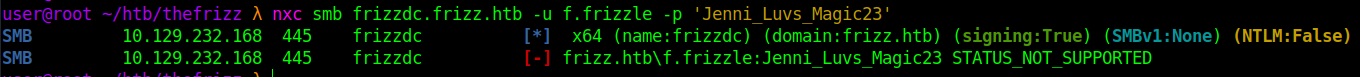 nxc smb frizzdc.frizz.htb -u f.frizzle -p 'Jenni_Luvs_Magic23' The authentication succeeds, confirming the credentials are valid domain credentials.